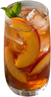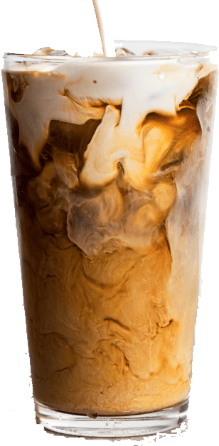 Café Espresso, Leche fría Saborizada con Extracto de Duraznos, Hielo Cristal.