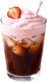 Café Espresso, Leche fría Saborizada con Extracto de Frutillas, Hielo Cristal.